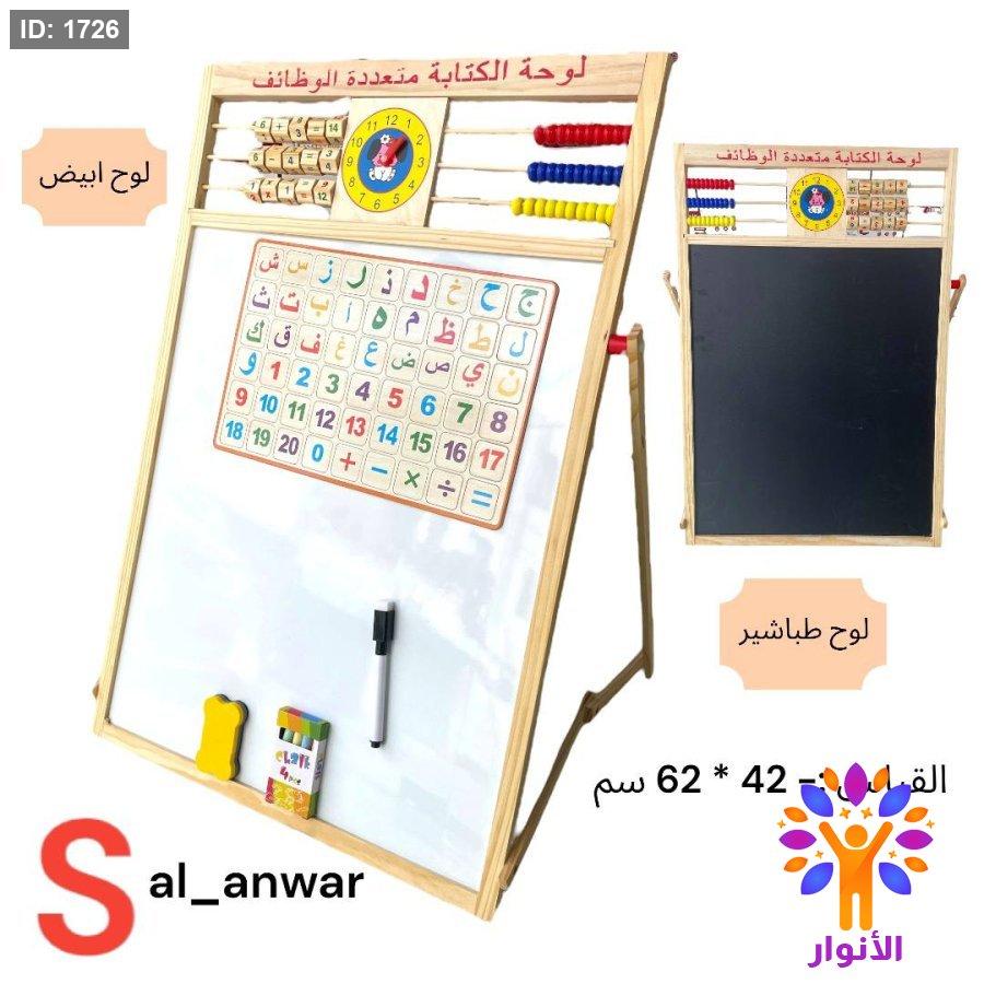 يحتوي على عداد للارقام وساعة للتدريب وقطع مغناطيس حروف عربية وارقام انجليزية ورموز الحساب .
