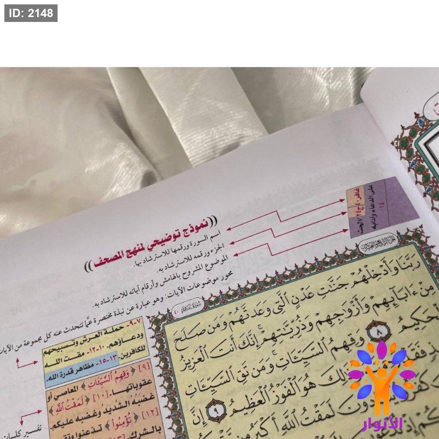 ٣- شرح جميع الموضوعات الموجودة بالفهرسة بهامش المصحف ، واستخراج ما فيها من الفوائد والدروس والعبر .