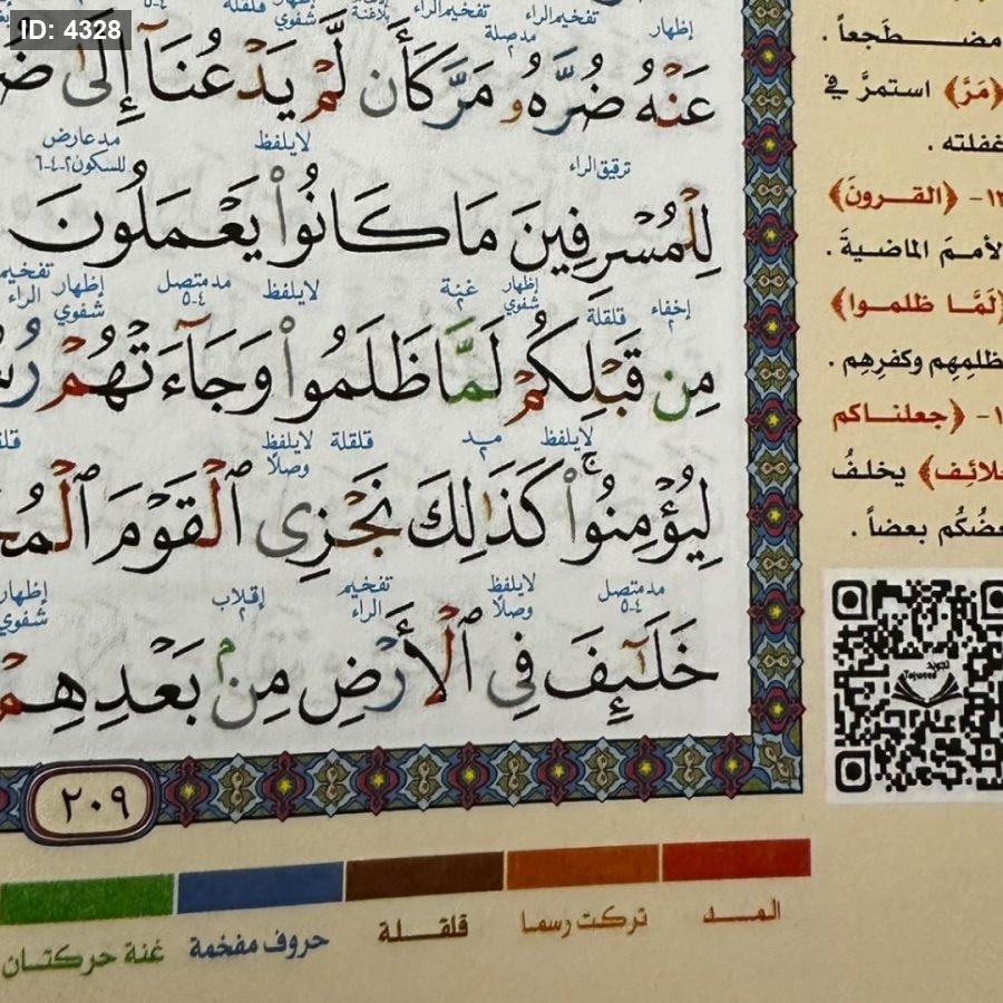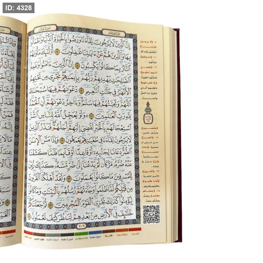 مصحف تعليمي ملوَّن يُعنى بتطبيق أحكام التجويد أثناء التلاوة، حيث تم تمييز الأحكام بالألوان لتسهيل معرفة مواضع المدود والغنة والإدغام والإخفاء وغيرها من القواعد. يتضمن شروحات جانبية مختصرة لبعض الكلمات وأحكامها، مع رمز QR يتيح الاستماع إلى تلاوة نموذجية تساعد القارئ على تصحيح النطق وتحسين الأداء. مناسب للتعليم الذاتي ولطلبة حلقات التحفيظ.