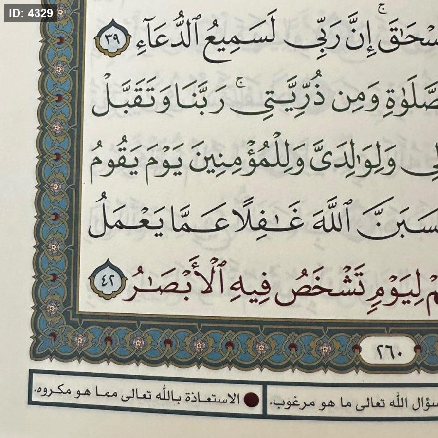 مصحف مميز يُعنى بإحياء سنة المناجاة أثناء التلاوة، حيث يوجّه القارئ إلى مواضع السؤال عند آيات الرحمة ومواضع الاستعاذة عند آيات العذاب، اقتداءً بهدي النبي صلى الله عليه وسلم. يتميز بإخراج أنيق وخط واضح، مع تنبيهات أسفل الصفحات تساعد على تطبيق المناجاة عمليًا أثناء القراءة من خلال الالوان ، مما يعين على حضور القلب والتدبر.